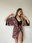 Bata estilo kimono de creppe, talle único, super amplia, con vivos negros en vista y mangas, presillas a los costaditos por el que pasa el lazo para anudar a la cintura.